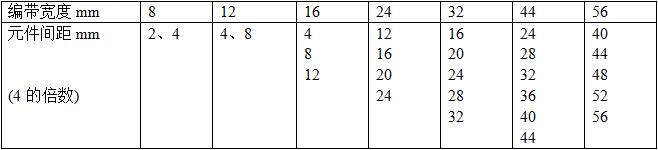 紙帶和塑料帶的孔距為4mm,(1.0*0.5mm以下的小元件為2mm),元件間距 4m的倍數(shù),根據(jù)元器件的長度而定。編帶的尺寸標(biāo)準(zhǔn)見表4-4。