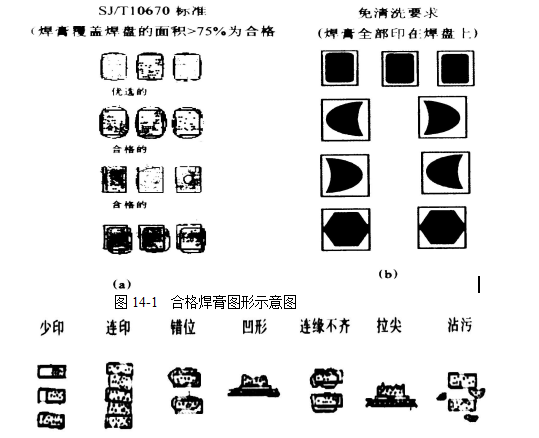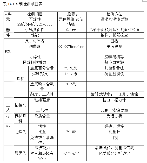 由于一般中、小企業(yè)都不具備材料的檢測手段,因此對于焊膏、貼片膠、棒狀焊料、焊劑、清洗劑等表面組裝材料一般不作檢驗(yàn),主要靠對焊膏、貼片膠等材料料生產(chǎn)廠家的質(zhì)量認(rèn)證體系的鑒定,并固定進(jìn)貨渠道,定點(diǎn)采購。進(jìn)貨后主要檢查產(chǎn)品的包裝、型號、生產(chǎn)廠家、生產(chǎn)日期和有效使用期是否符號要求,檢查外觀、顏色、氣味等方面是否正常,另外,在使用過程中觀察使用效果,例如對焊膏,主要觀察印刷性和觸變性是否良好,室溫下使用時間的長短,焊后的焊點(diǎn)表面形;吠、浸潤性,以及錫球和殘留物的多少等,發(fā)現(xiàn)問題應(yīng)及時與供應(yīng)商進(jìn)行聯(lián)系解決。