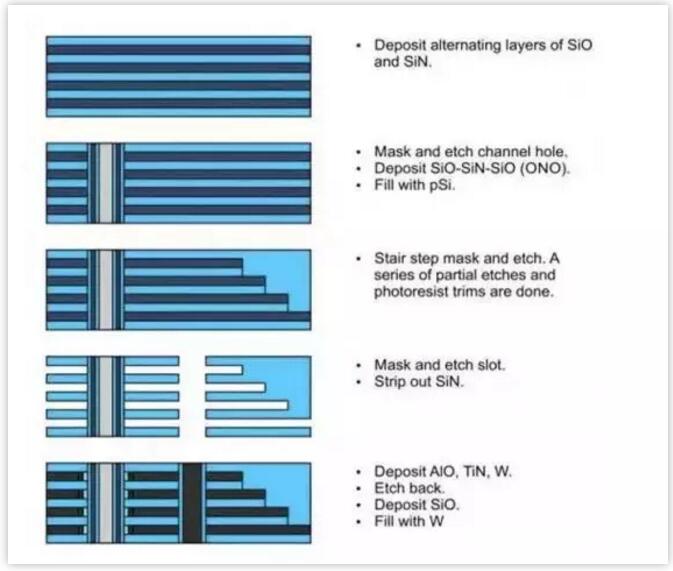 三星則開發(fā)了 Terabit Cell Array Transistor (TCAT)工藝。TCAT 是一種后柵極方法( gate-last approach),其沉積的是交替的氧化物和氮化物層。然后形成一個穿過這些層的通道并填充 ONO 和 pSi。然后與 BiCS 工藝類似形成階梯。最后,蝕刻一個穿過這些層的槽并去除其中的氮化物,然后沉積氧化鋁(AlO)、氮化鈦(TiN)和鎢(W)又對其進行回蝕(etch back),最后用塢填充這個槽。如下圖所示: