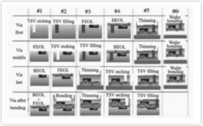 根據(jù)通孔制作的時間不同,3D TSV通孔集成方式可以分為四類: