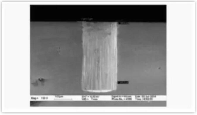 圓片上通孔制造是TSV技術(shù)的核心,目前,鉆蝕TSV技術(shù)主要有兩種,一種是干法刻蝕或稱博世刻蝕,另一種是激光刻蝕。博世工藝為MEMS工藝而開發(fā),快速地在去除硅的SF6等離子刻蝕和實現(xiàn)側(cè)壁鈍化的C4F8等離子沉積步驟之間循環(huán)切換。下圖為南京電子器件所(NEDI)利用博世工藝制作的TSV硅通孔。