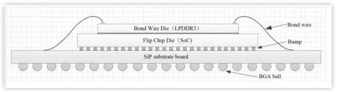 另一種常見的方式是將一顆倒裝焊(flip-chip)裸芯片安裝在SiP基板上,另外一顆裸芯片以鍵合的方式安裝在其上方,如下圖所示,這種3D解決方案在手機中比較常用。