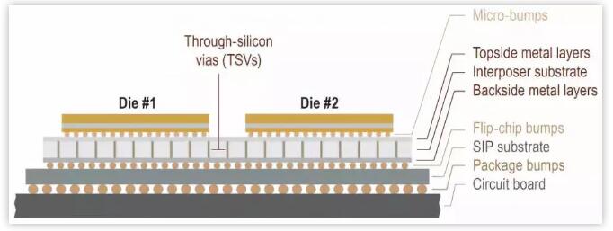 在SiP基板與裸芯片之間放置一個中介層(interposer)硅基板,中介層具備硅通孔(TSV),通過TSV連結(jié)硅基板上方與下方表面的金屬層。有人將這種技術(shù)稱為2.5D,因為作為中介層的硅基板是無源被動元件,TSV硅通孔并沒有打在芯片本身上。如下圖所示: