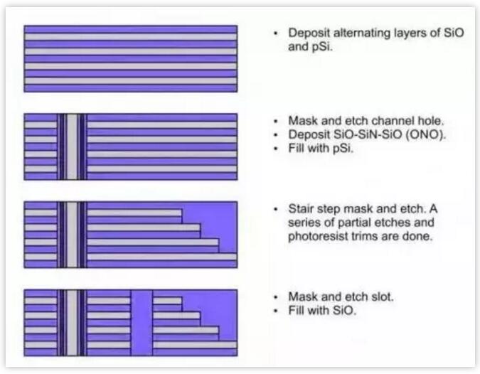 東芝開發(fā)了 Bit Cost Scalable(BiCS)的工藝。BiCS 工藝采用了一種先柵極方法(gate-first approach),這是通過交替沉積氧化物(SiO)層和多晶硅(pSi)層實現(xiàn)的。然后在這個層堆疊中形成一個通道孔,并填充氧化物-氮化物-氧化物(ONO)和 pSi。然后沉積光刻膠,通過一個連續(xù)的蝕刻流程,光刻膠修整并蝕刻出一個階梯,形成互連。最后再蝕刻出一個槽并填充氧化物。如下圖所示: