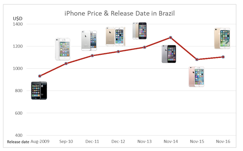 但是,富士康的出現(xiàn)并沒讓蘋果產(chǎn)品的價格下降。iPhone 6 發(fā)售時,在巴西的售價比美國售價高了 97%。甚至,連按時發(fā)售都做不到。巴西消費(fèi)者見到 iPhone 4S 時,已經(jīng)比全球發(fā)售時間推遲了至少兩個月。