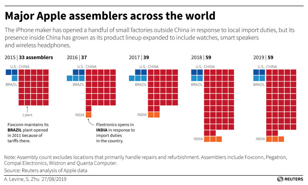 但是在這里產(chǎn)出的蘋果數(shù)量相比全球?qū)μO果的需求而言,只是杯水車薪。路透社 2019 年 8 月經(jīng)過調(diào)查后發(fā)布的報告顯示,蘋果在印度和巴西兩國生產(chǎn)的產(chǎn)品只是用來滿足當(dāng)?shù)匦枨螅谥袊黾拥奶O果代工廠遠(yuǎn)超過中國以外。